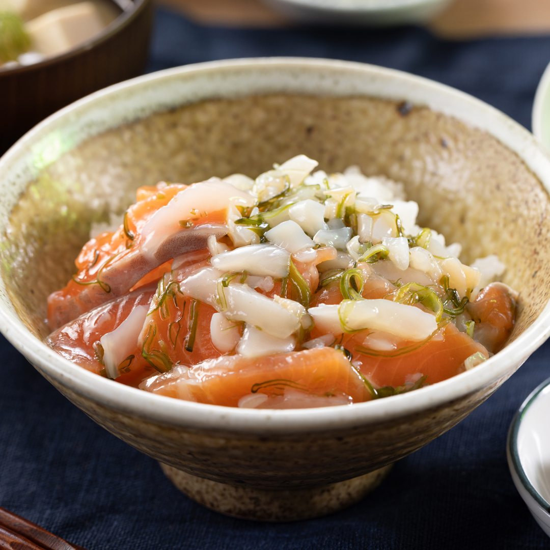 その名の通り、原料を三陸産に限定した商品で、「宮城県産銀鮭(養殖)」と、イカ・メカブ・ツブいくらの魚介類をベースに、甘みが特徴の”白醤油”を使用した弊社独自の秘伝タレで味付けしました。